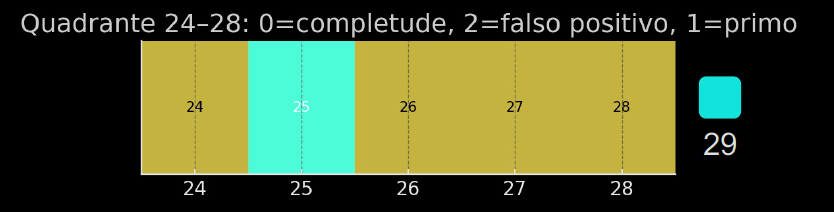 Quadrante 24–28. 0=completude; 2=falso positivo (25); 1=primo (não aparece nesse trecho).